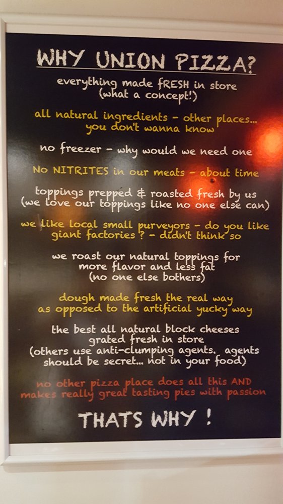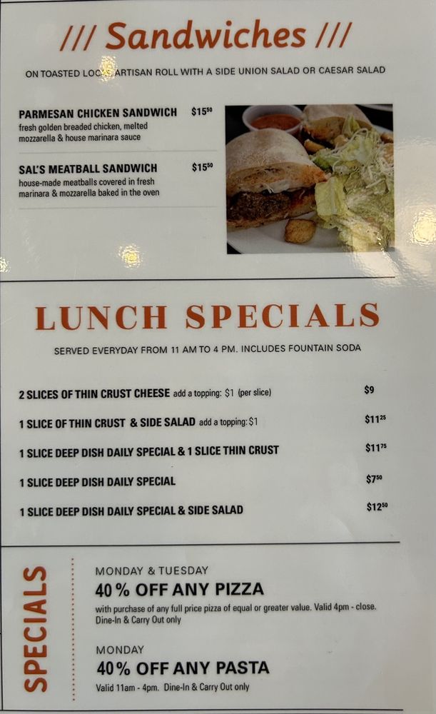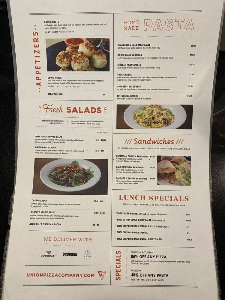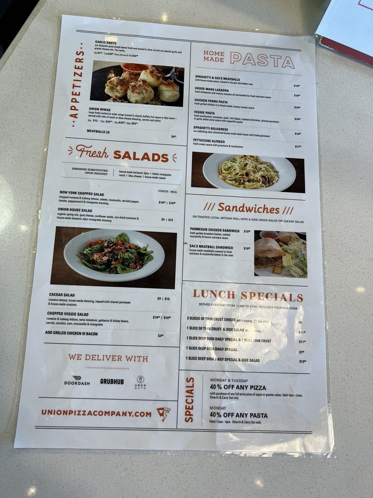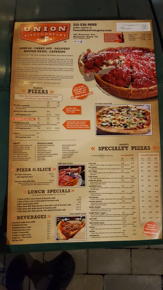 Introducing the menu at Union Pizza Company, where customers rave about the delicious deep-dish and thin-crust pizzas. Located in Manhattan Beach, CA, this restaurant offers vegan and vegetarian options, along with a variety of amenities like delivery, takeout, and private dining. With options for outdoor seating and wheelchair accessibility, Union Pizza Company caters to a diverse range of diners. The reviews speak for themselves, praising the flavorful pizzas and fast service. Whether you're craving a classic Margarita pizza or a unique Bright Flame Veggie, Union Pizza Company delivers on quality and taste. Don't miss out on their lunch special, which includes a slice of deep dish and a fountain drink. Experience the best of Chicago and New York-style pizzas on the West Coast at Union Pizza Company.